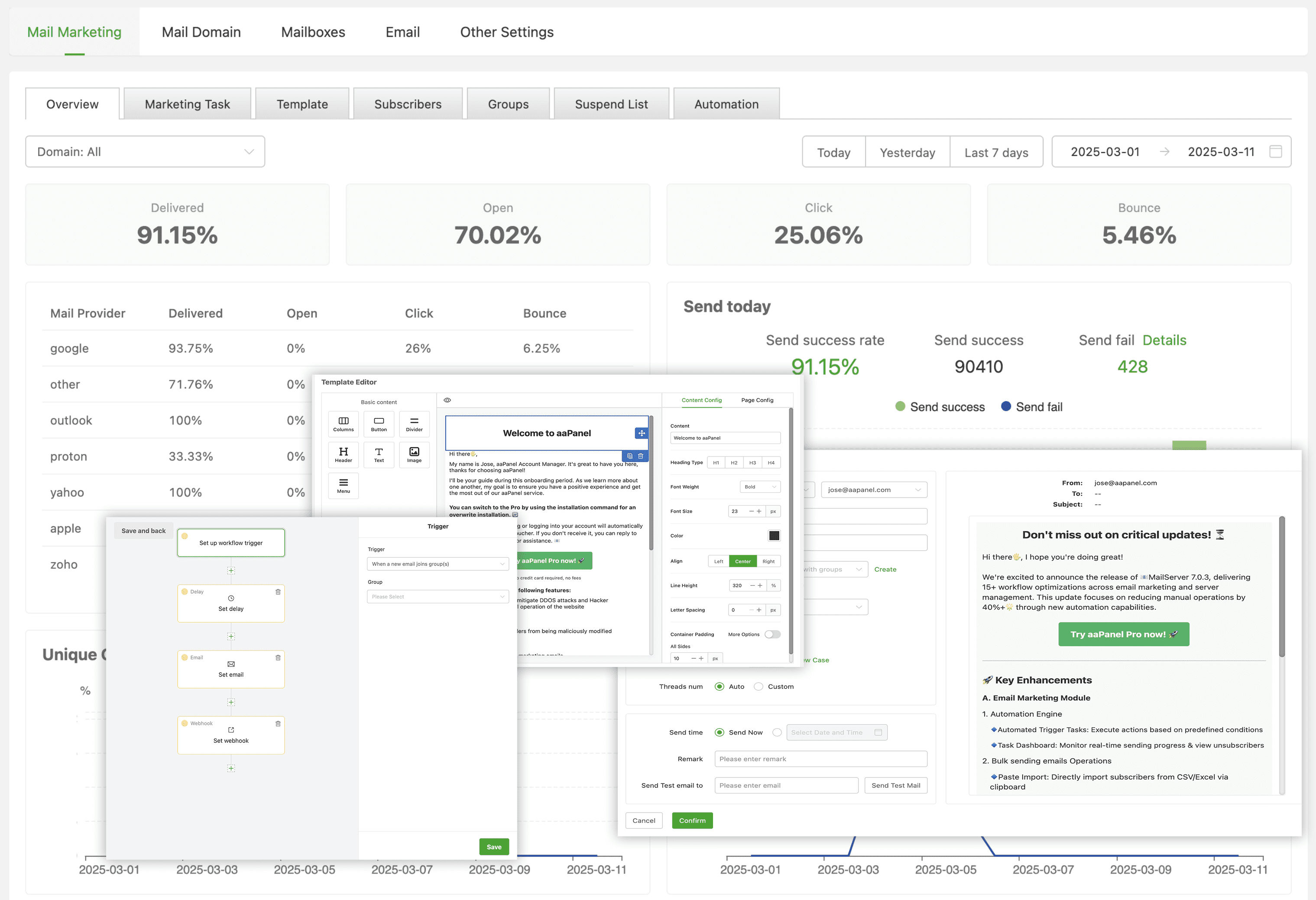 aaPanel email marketing capabilities help you create, send, and track effective marketing emails easily and quickly
