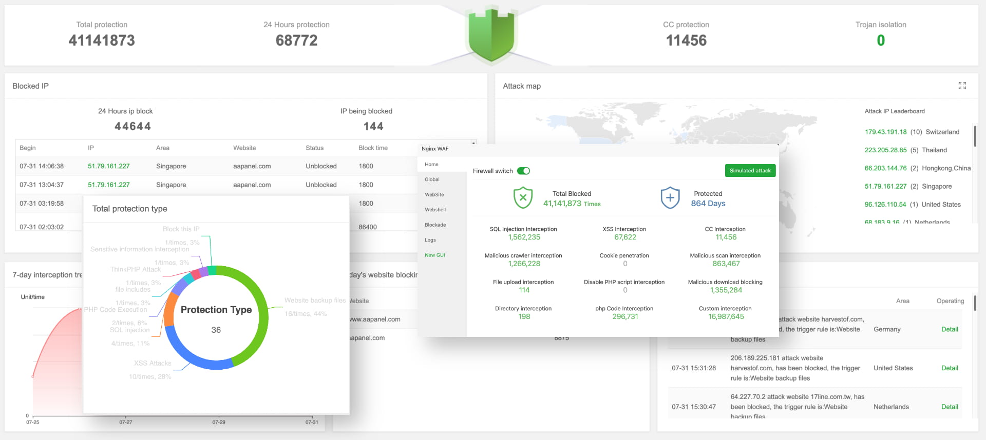 aaPanel WAF can block 99% of CC attacks and mitigate DDOS attacks, effectively block malicious access by hackers,